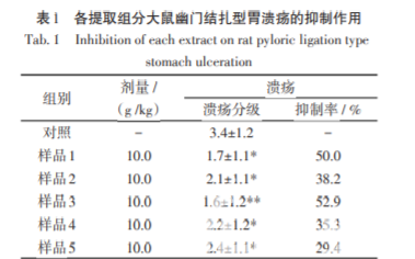 用藥效結果 各提取組分對大鼠幽門結扎型胃潰瘍的抑制 作用藥效試驗結果用t值法進行統計分析,結果見 表1。